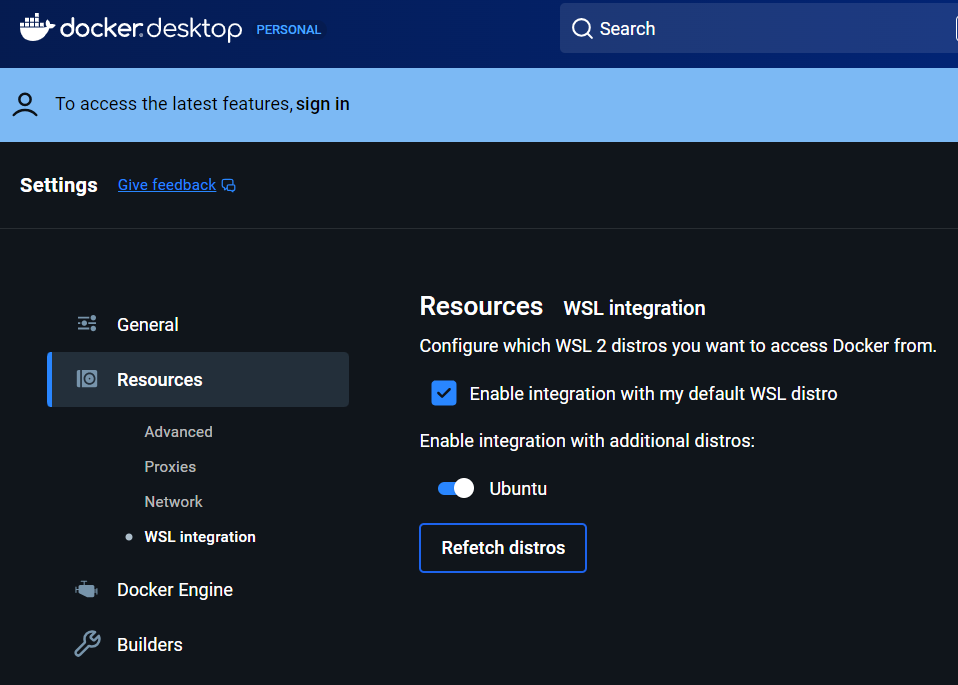 - Docker Desktop > Settings > Resources > WSL Integration에서 Ubuntu 체크 후 Apply & restart