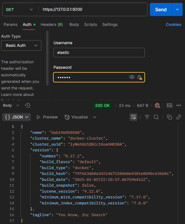 - 로컬로 접속을 했고, Elasticsearch 컨테이너 토큰값이 필요하다.