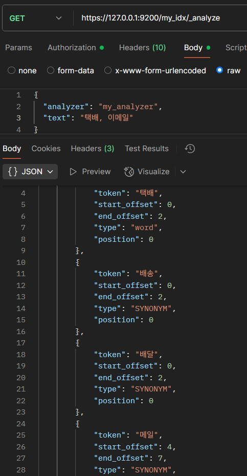 택배를 검색하면 type이 synonym인 배송, 배달이 함께 검색되고, 이메일 > 메일로 검색되는 것을 확인할 수 있다.