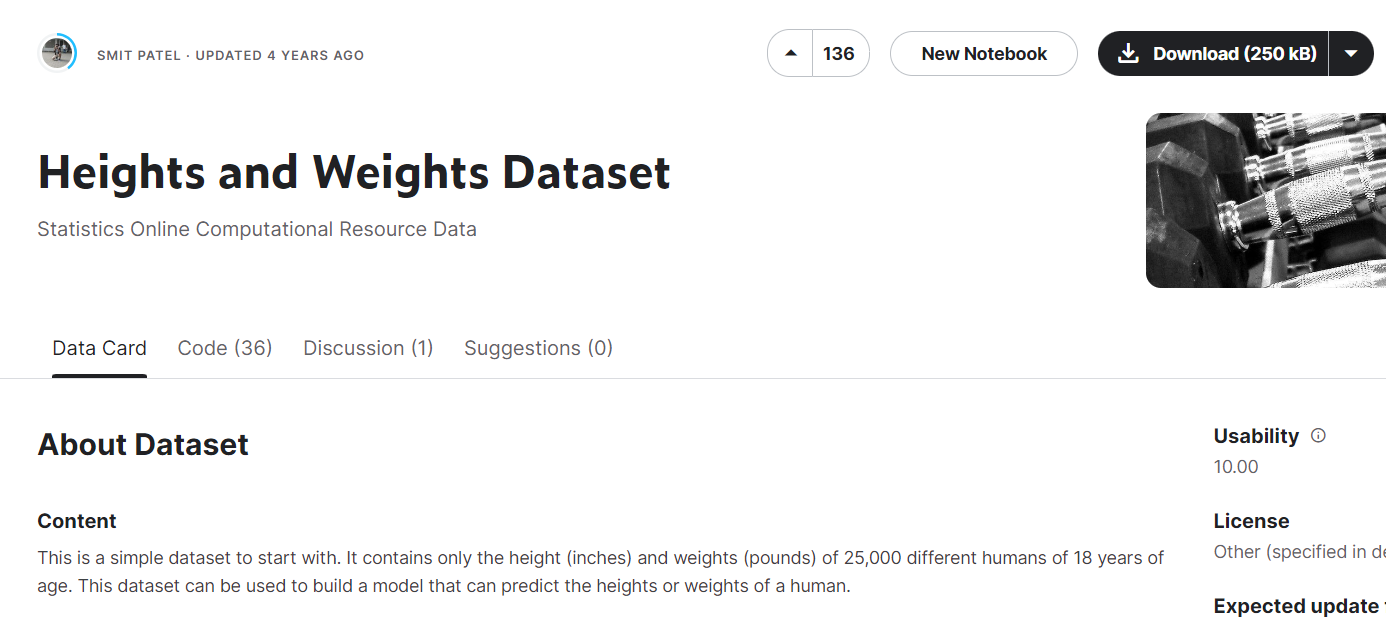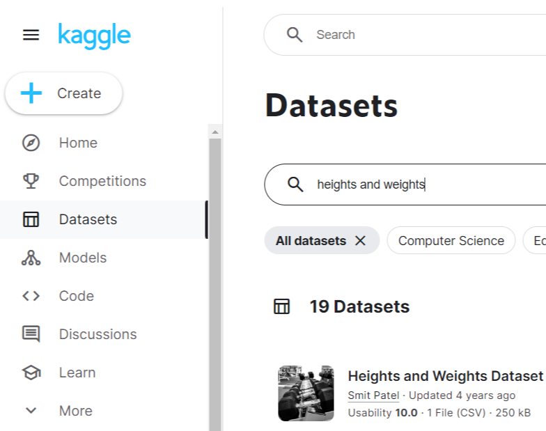 캐글 -> Datasets -> Heghts and Weights 검색 -> csv 다운로드 후 실습 진행