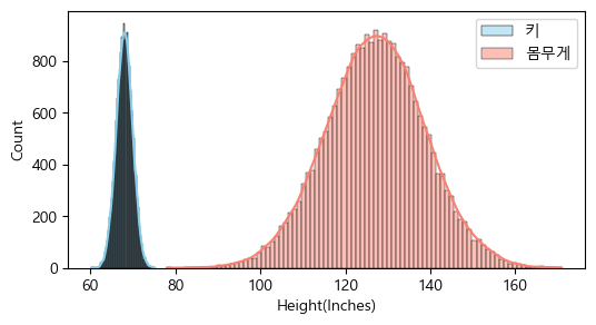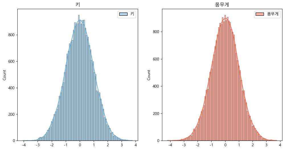 sns.histplot(scaler_data['몸무게'], kde=True, palette="Reds", ax=ax2)