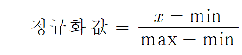 - 수치형 데이터 값을 0과 1 사이의 값으로 변환