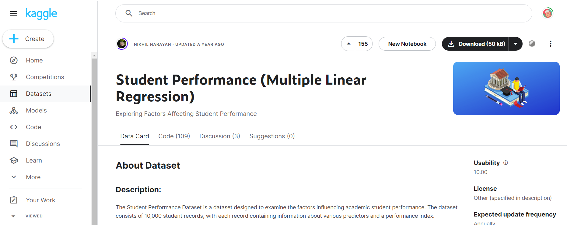 캐글 -> Datasets -> Student Performance 검색 -> csv 파일 다운로드 후 실습 진행