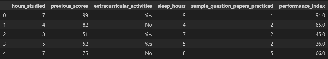 performance_index ~ (hours_studied) + (previous_scores) + (sleep_hours) + (sample_question_papers_practiced)