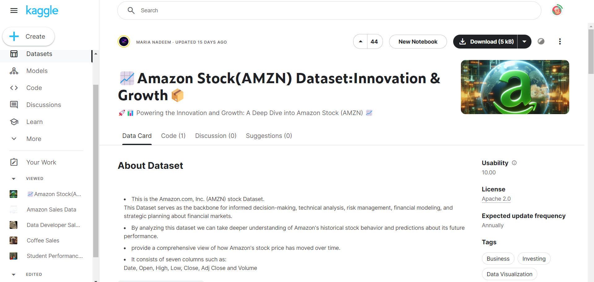 캐글 -> Datasets -> Amazon Stock csv 파일 다운로드 후 실습 진행