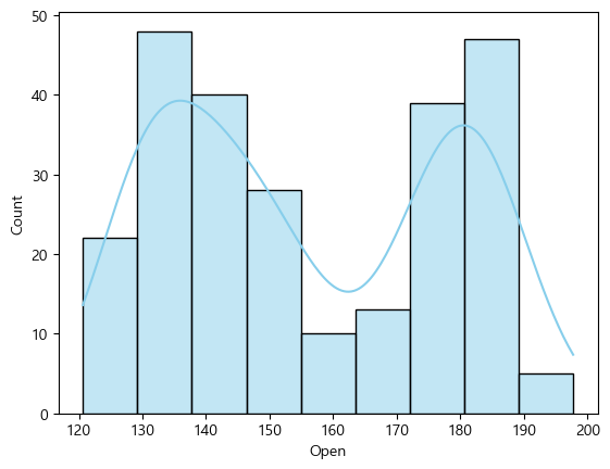 sns.histplot(x = data['Open'], kde=True, color='Skyblue')