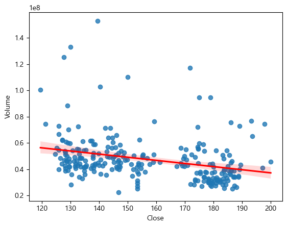 sns.regplot(x = data['Close'], y = data['Volume'], line_kws = {'color': 'red'})
