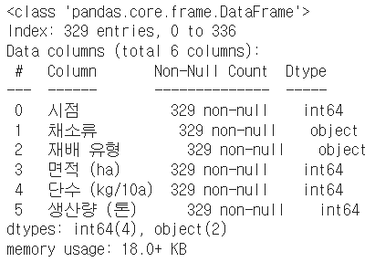 -> 면적, 단수, 생산량 데이터가 모두 int 타입으로 변경된 것을 확인할 수 있다.
