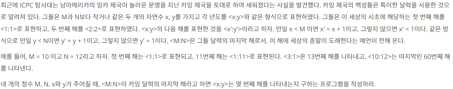 - <M:N>은 달력의 마지막 해이고, <x:y>가 몇 번째 해인지 구하는 문제