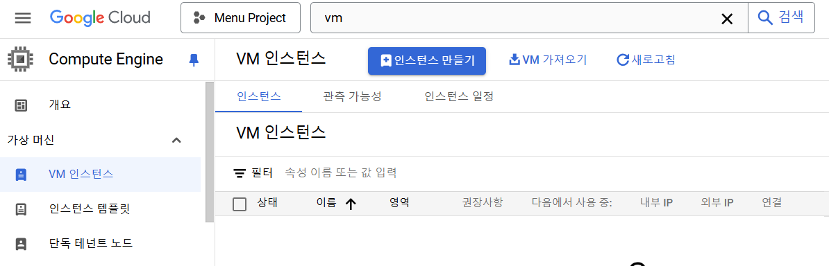 - Compute Engine → vm → 인스턴스 만들기 선택