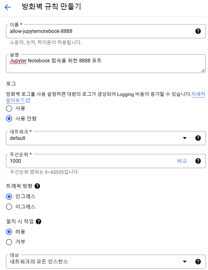 - Jupyter Notebook을 사용하려면 8888 포트를 사용해야 하므로 방화벽 설정이 필수입니다.